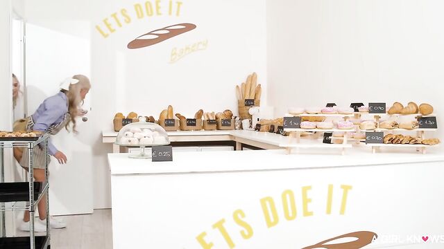 Descrizione: The girls can't keep their hands off each other even when customers are standing right in front of them. They get caught fucking with a strap-on dildo, but even that doesn't stop them, and they tell the shocked clients to take what they want so they can finish the job in the back room. When a third hot girl staff member walks in on them, she joins the fun, and the three horny beauties fuck like rabbits until everybody cums.